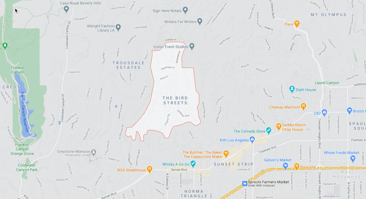 One neighborhood that most folks have never heard of is the Bird Streets. The “Hollywood Reporter” declares that the Bird Streets–the exclusive area above the Sunset Strip where the streets are named after birds like Oriole, Thrasher, and Nightingale–is hotter than ever.