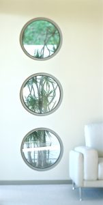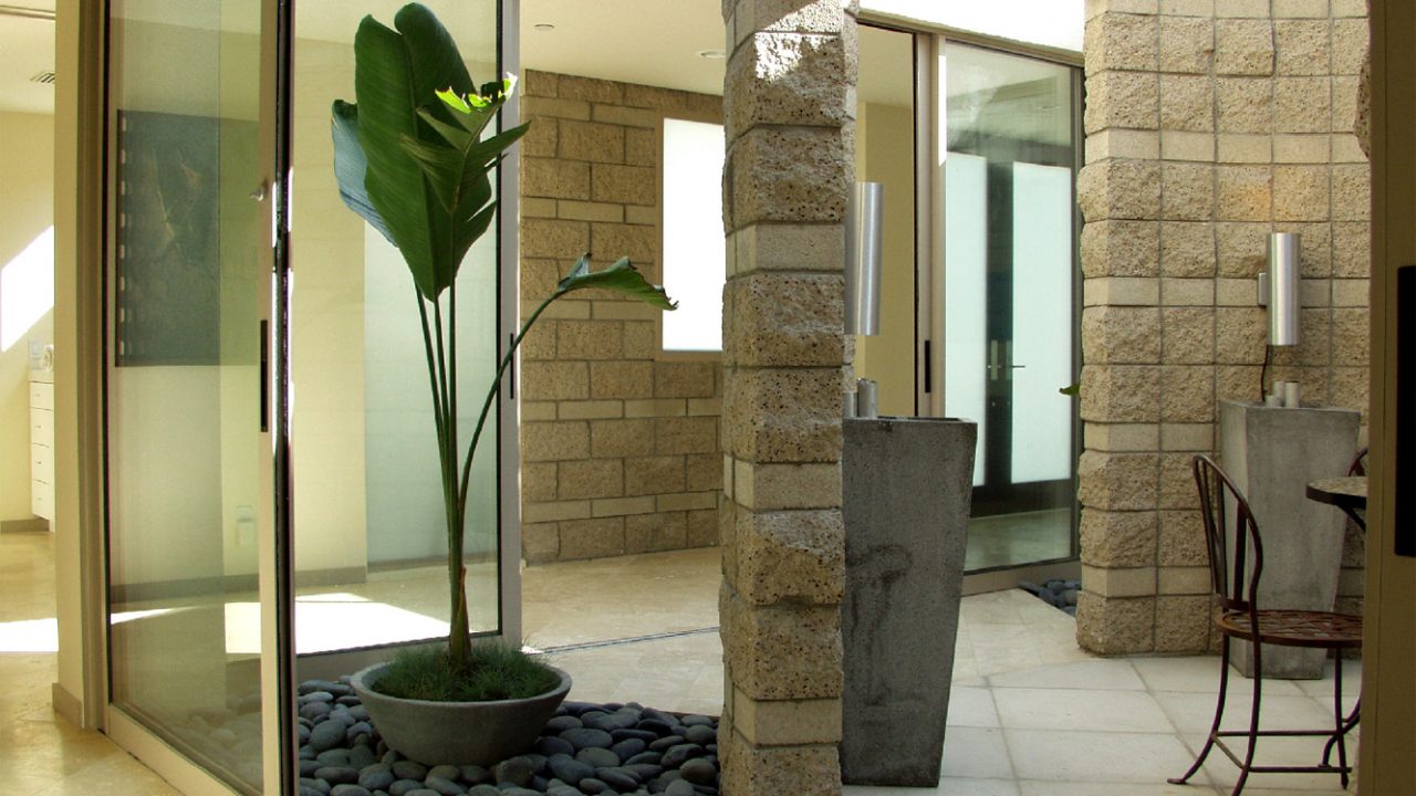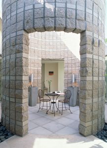 Outside, new textured concrete block walls refresh the front elevation, layering the façade with the natural materials to emphasize the new entry. The circle form acts to bring the outdoors in, both complementing and softening the rigid geometrics of the wall. As a unifying design motif, the circle appears throughout the home, as seen in the entry courtyard and master bath illustrations.