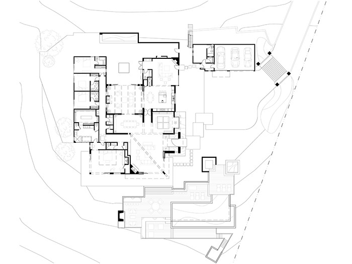 An existing 3,800-square-foot residence was enlarged and a new guesthouse and pool were added to take advantage of the specular 270-degree view. The previous 1980s French-style remodel was removed to reveal the home’s mid- century roots, and the structure re-conceived to fit our client’s 21st-century lifestyle.