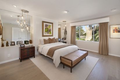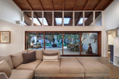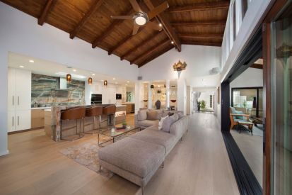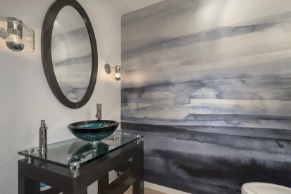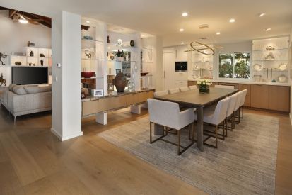 We improved the indoor outdoor connection and opened up spaces that were cramped and dark. A new 16′ door was added between the existing outdoor loggia and family kitchen and, combined with finishing the ceilings to match, unifies the spaces. The kitchen was expanded and outfitted with gourmet appliances to better suit the client’s love of cooking. The existing dark, small dining room was opened up and visually connected to all public spaces of the home. The new divider between the family kitchen and dining room provides separation, but is open enough to take advantage of the family kitchen’s natural light. Glass shelves provide spaces to display the many mementos collected during their extensive travels. All finishes were changed in the house, with an emphasis on clean and light. Most of the color comes from accents and their impressive art collection which is allowed finally to be the focus of the room. In keeping with this, the Picasso stone that was selected became art itself; the stone is displayed in the kitchen and its colors are used throughout the home to unify and harmonize the spaces.